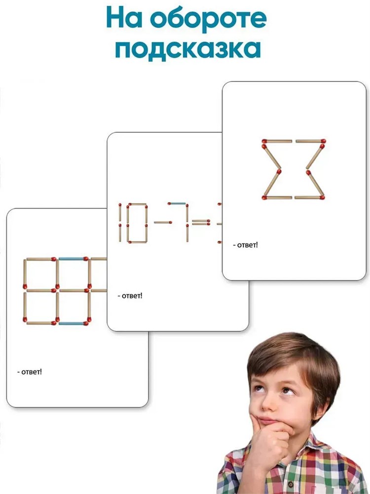 На каждой карточке изображение из спичек — задача в том, чтобы, переместив 1–2 спички, получить новую фигуру или предмет.
