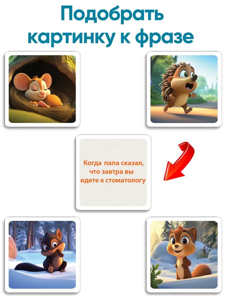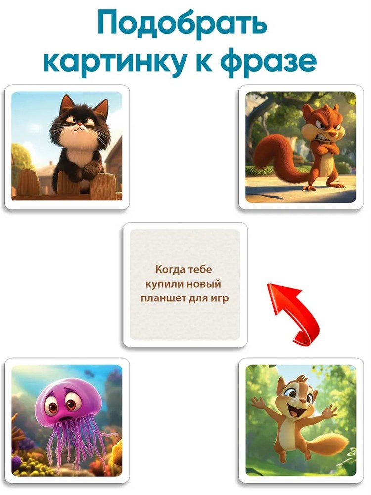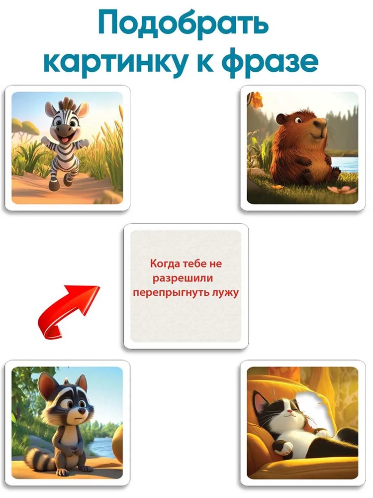 100 карточек с ситуациями и 100 с животными — сочетания всегда новые.