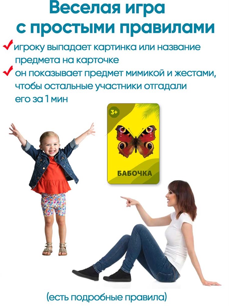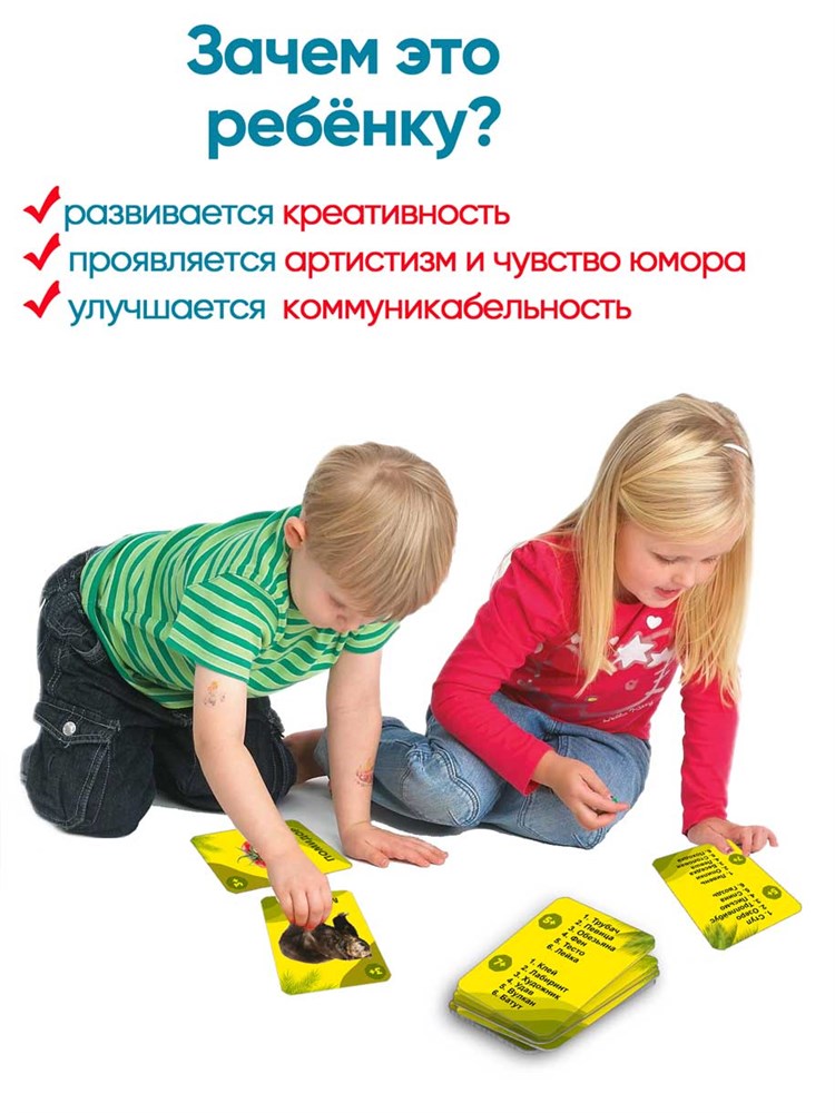 Игроки по очереди вытягивают карточки и показывают животное, предмет или действие, не используя слова. Остальные стараются как можно быстрее угадать.