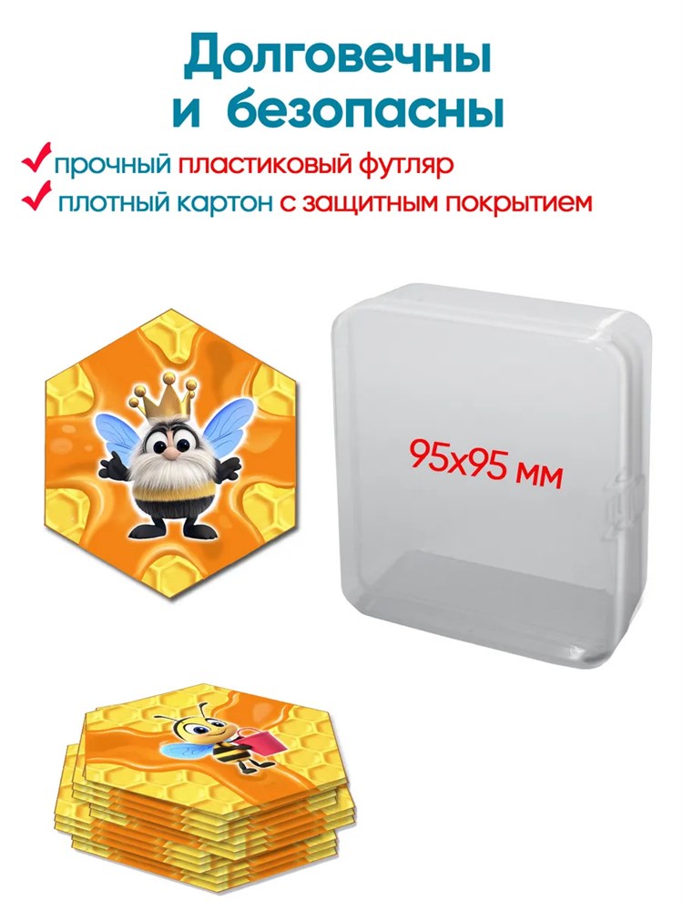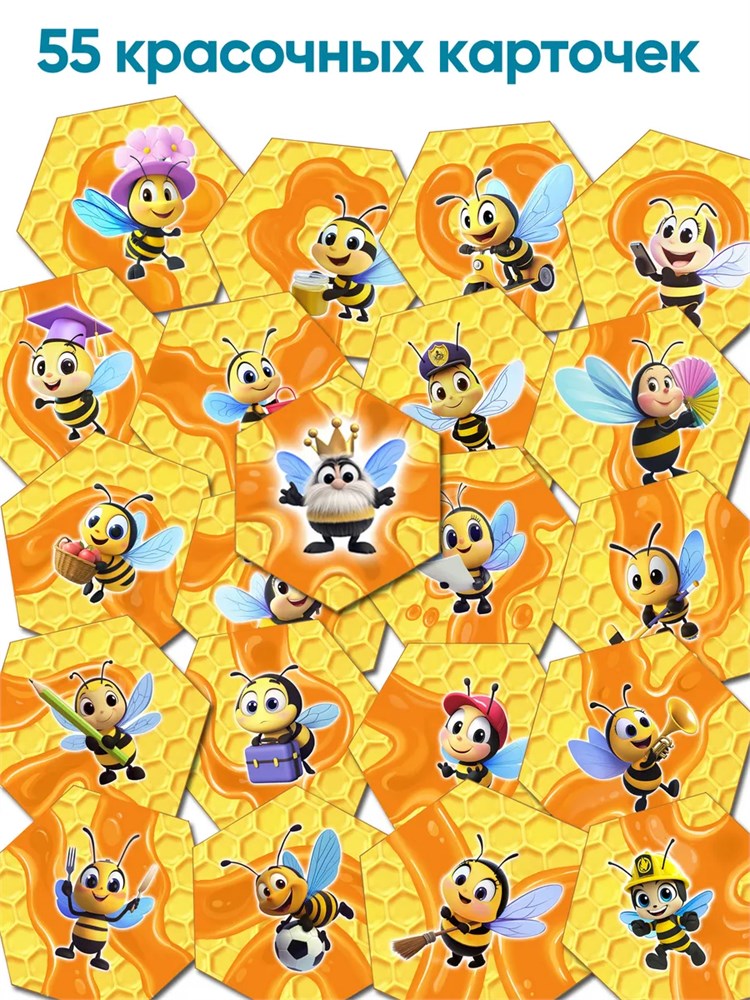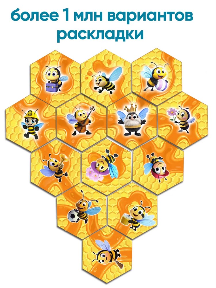 Состав игры: 54 пазла с медовыми ручейками и пчелами + 1 пазл с пчелой Королем (с бородой, в короне).