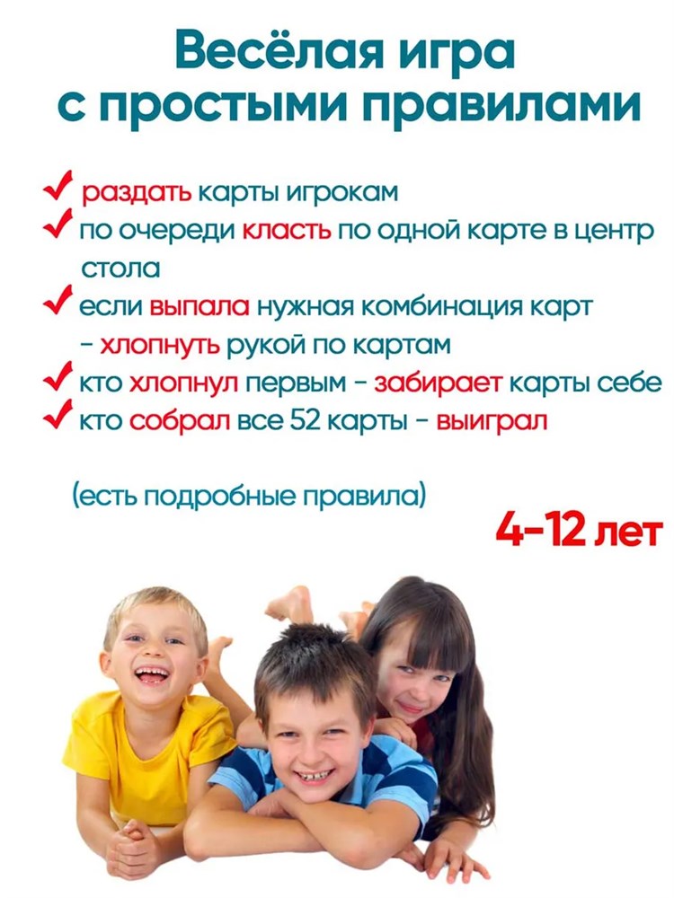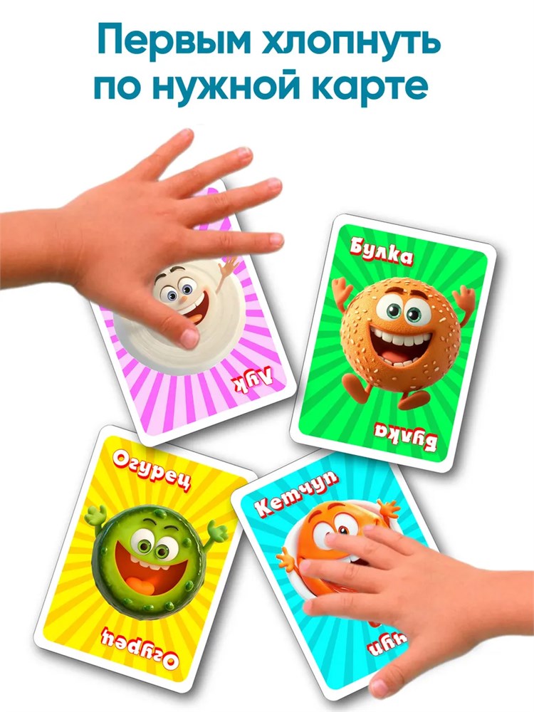 Игроки следят за картами, ищут нужные комбинации и хлопают по столу, чтобы собрать их первыми. Веселая динамика и азарт делают каждую партию увлекательной!