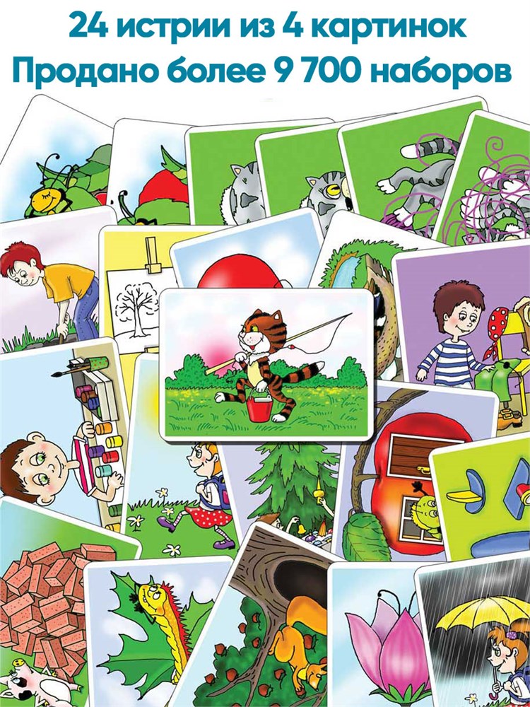 Ребёнок выбирает сюжет, раскладывает 4 карточки в правильном порядке и рассказывает, что происходит.